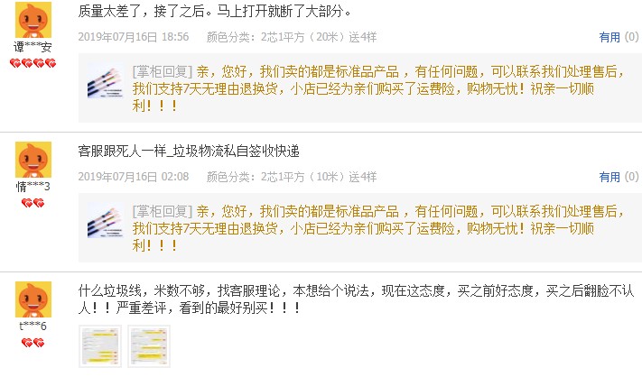 評價截圖有很多,我這邊就不一 一發(fā)出來了,總結幾個特征,冒充國標,截面積虛標,米數不足,導體斷線,鋁鍍銅,這個就是低價的本質,如果你是買回家當擺設并且不怕刺鼻味的,盡可能多買點,其余用途作為晾衣繩都怕斷。